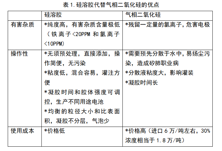 胶体蓄电池广泛使用气相二氧化硅作为凝胶剂,但它有许多缺点:污染工作环境,特别是在混合过程中;职业病及搬运问题;体积大不便运输,凝胶时间长;成本高。因此,纯度高、粒径合适的硅溶胶是解决这些问题的一个非常好的选择。