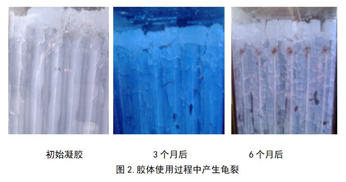 胶体形成后,经过一定时间达到使用效果(3-6个月以后),此时胶体龟裂(如图2),裂缝为电池充电过程中产生的氧气提供通道,使氧气能穿过裂缝从负极到达正极而被吸收,达到免维护的效果。