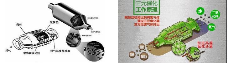 三元催化器类似消声器,它的外面用双层不锈薄钢板制成筒形。在双层薄板夹层中装有绝热材料----石棉纤维毡。内部在网状隔板中间装有净化剂。净化剂由载体和催化剂组成。载体一般由Al2O3或SiO2制成,其形状有球形、多棱体形和网状隔板等。催化剂用的是金属铂、铑、钯等稀有金属材料,将其中一种喷涂在载体上,就构成了净化剂。通常净化剂的蜂窝结构密度为1200目/平方英寸左右,可以将排气中大部分的有害物质转换成无害物质。