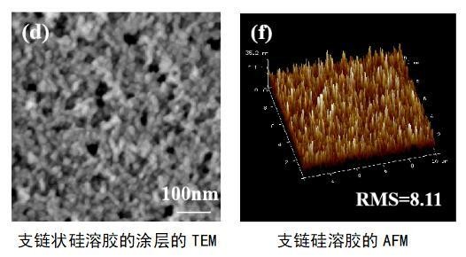 (1)将支链状硅溶胶用于制备超亲水涂层,扫描电镜(SEM)可以明显地观察到涂层存在大量的纳米孔,有助于形成超亲水涂层;原子力显微镜(AFM)观察到用支链状硅溶胶制备的涂层粗糙度明显增大。