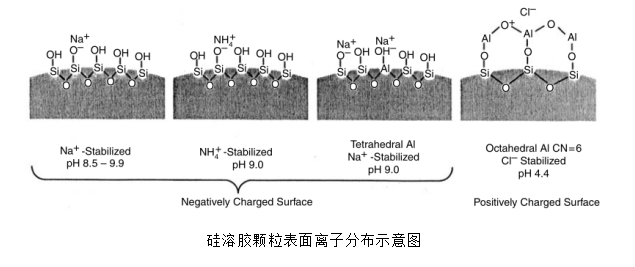 多数牌号的硅溶胶中二氧化硅颗粒的表面电荷性质呈现出负电。硅溶胶颗粒表面主要由硅羟基组成,其结构式为-Si-OH。在碱性pH条件下,颗粒表面带有阴离子电荷,需要通过结合阳离子物质(如Na+、K+、NH4+)来保持硅溶胶的稳定性。硅溶胶在8-10.5的pH范围内保持相对稳定,不会产生胶凝和沉降现象。