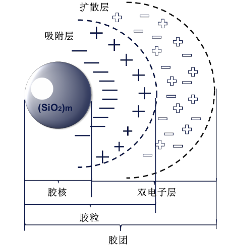 硅溶胶之所以能够在一段时间内保持稳定,是因为硅溶胶的双电层结构。硅溶胶粒子的结构如下图所示。